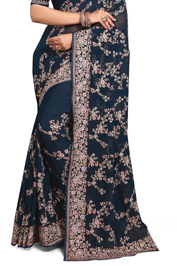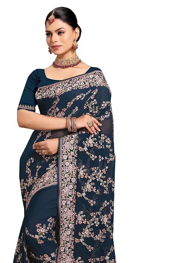 Teal Blue Zari Resham Embroidered Georgette Saree Sari with Matching Blouse Piece